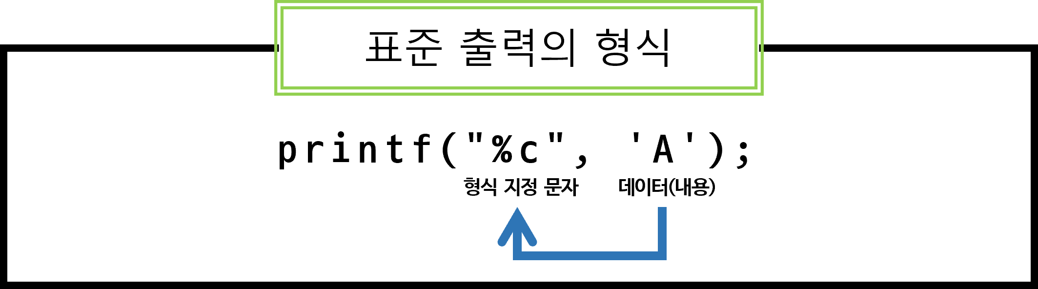한 개의 문자를 출력하려면 형식 지정 문자 %c를 사용하여 작은 따옴표(' ')를 이용해서 표기한다.