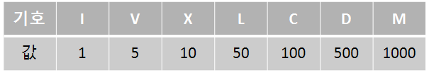 로마 숫자들 중 이 문제에서는 다음과 같은 7개의 기호만 활용한다.