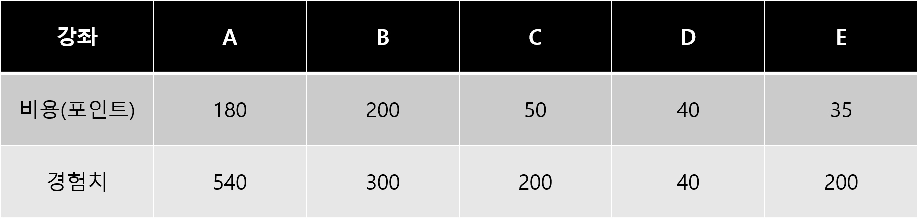 이 경우, 세종이는 285포인트를 사용해서 B, C, E 강좌를 수강하여 700만큼의 경험치를 얻을 수 있다.