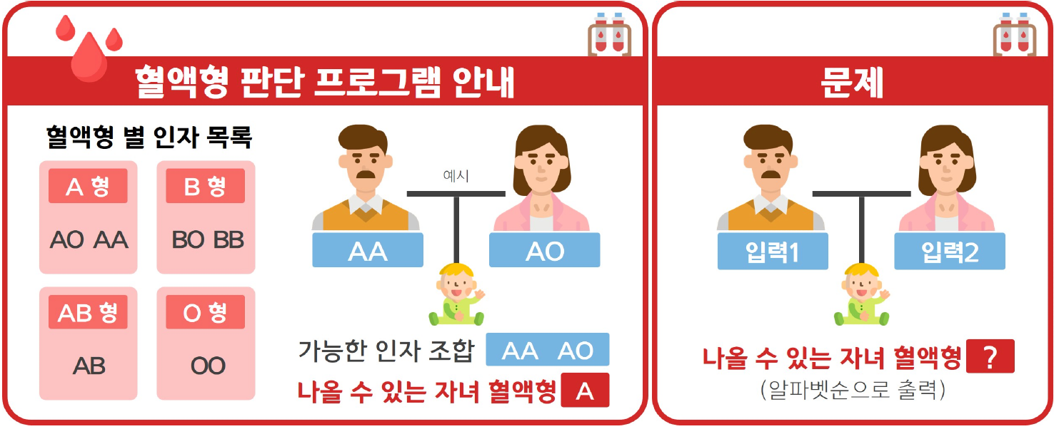 부모의 혈액형 인자 정보를 입력받았을 때, 나올 수 있는 자녀의 혈액형을 모두 출력해보자.