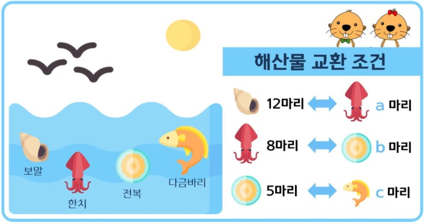 두 번째 줄에 "해산물 교환 조건" 그림의 a, b, c에 해당하는 값이 스페이스로 구분되어 입력된다.