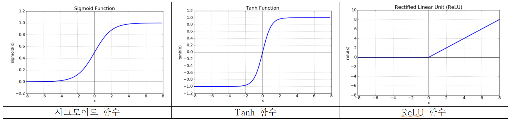 활성화함수는 크게 SIgmoid 함수, Tanh 함수, ReLU 함수로 나뉘어진다.