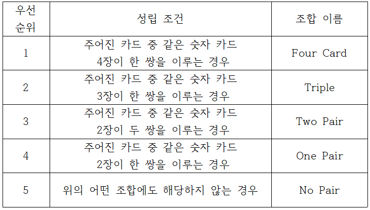 포커에서 숫자로만 만들 수 있는 카드 조합은 뽑은 카드 중에서 중복되는 숫자의 개수에 따라 아래 표처럼 분류할 수 있다.