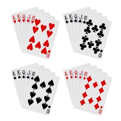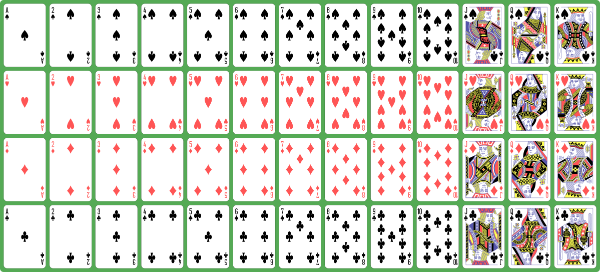 문양 별로 1(A), 2, 3, 4, 5, 6, 7, 8, 9, 10, 11(J), 12(Q), 13(K) 13개의 숫자 카드로 구성된다.