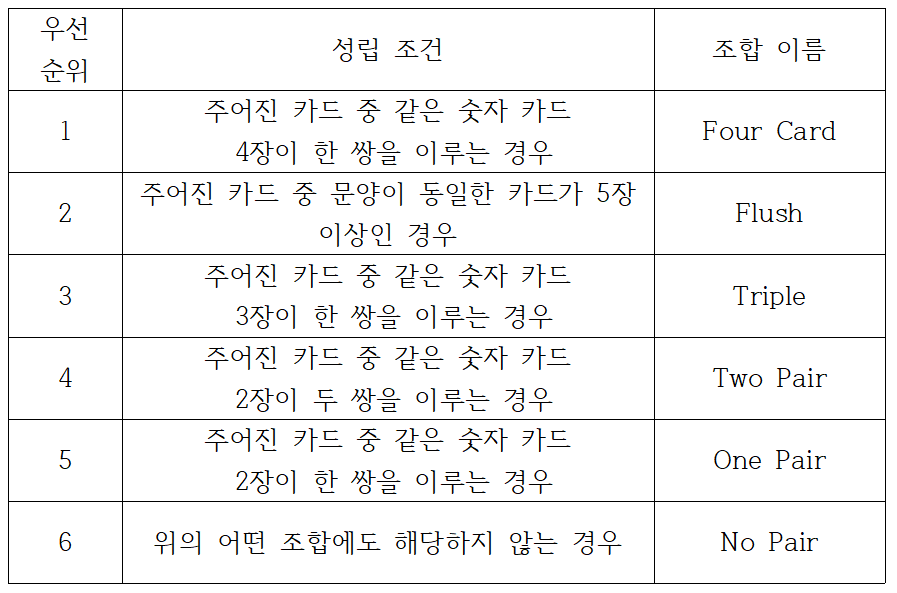 Flush(플러쉬)의 우선순위는 4장의 동일한 한 쌍을 이루는 Four Card보다는 낮고 Triple 보다는 높다.